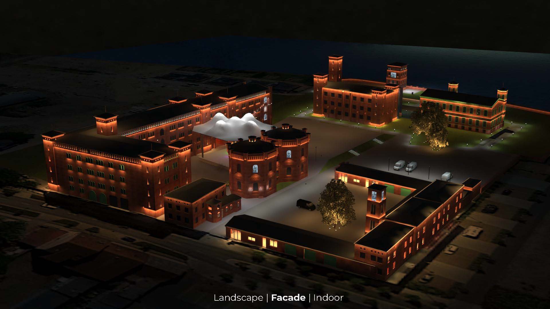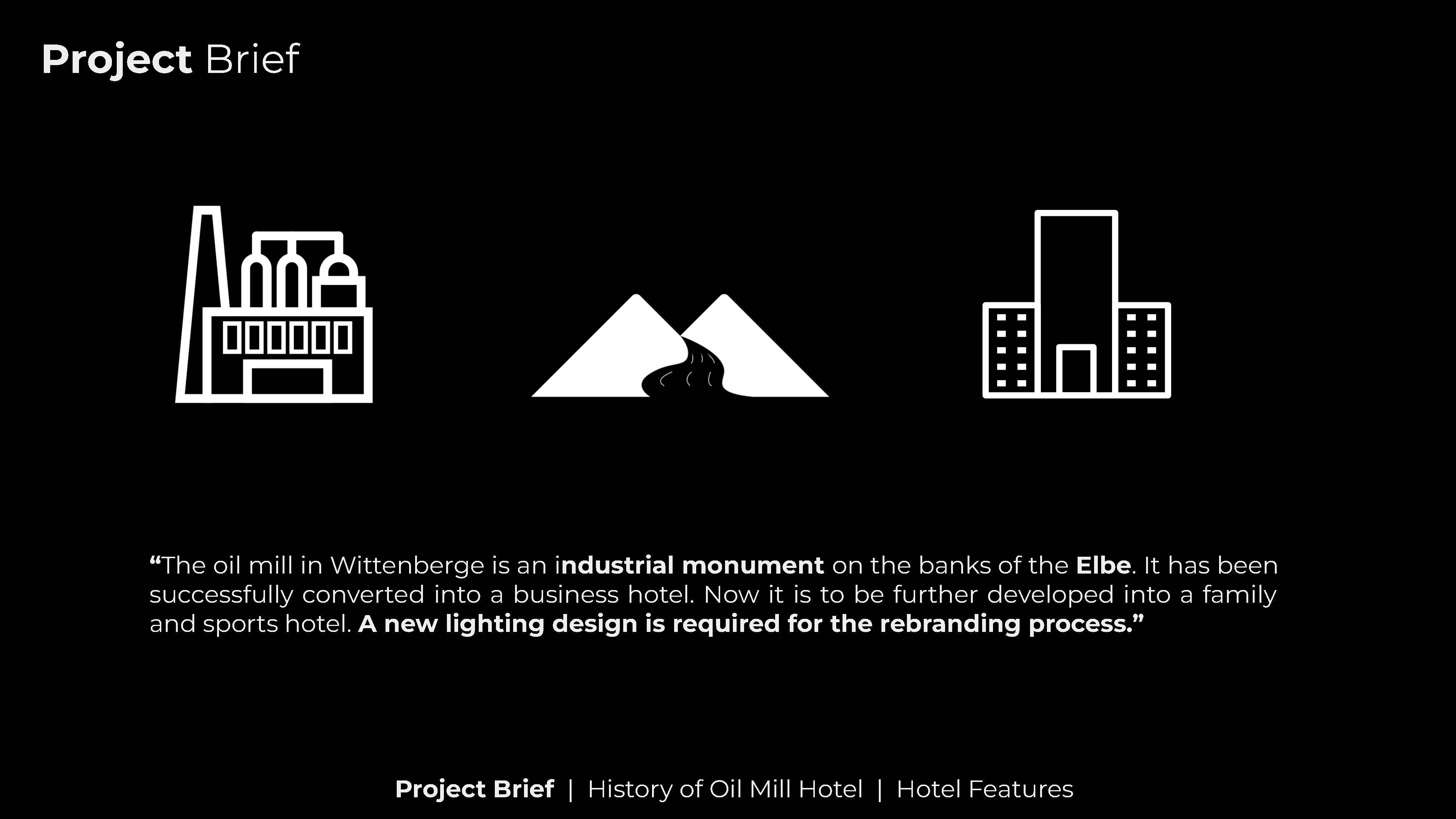 “The oil mill in Wittenberge is an industrial monument on the banks of the Elbe. It has been successfully converted into a business hotel. Now it is to be further developed into a family and sports hotel. A new lighting design is required for the rebranding process.”
